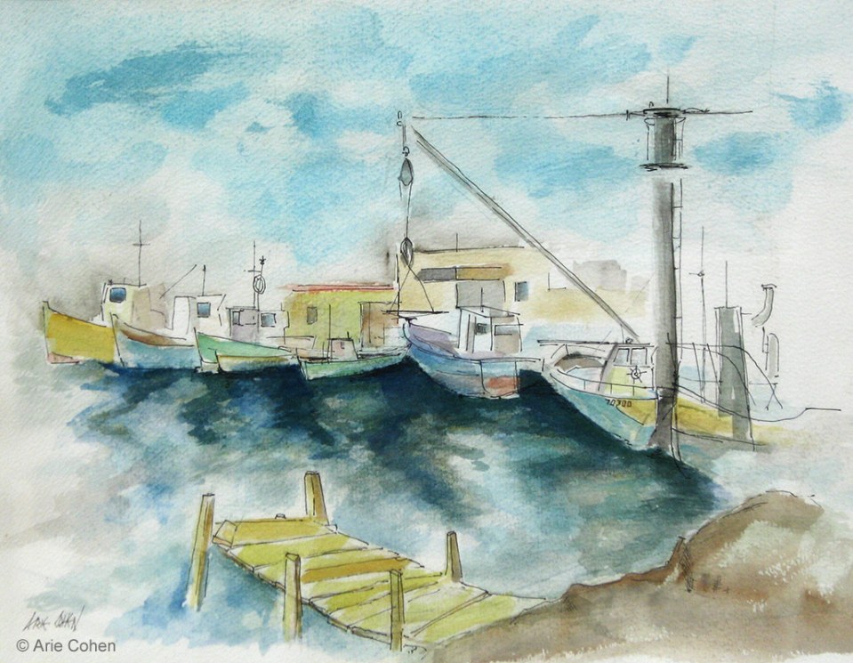 Fisherman-Boats-Aquarell-by-Arie-Cohen