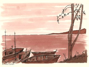 Aquarelle on paper, 24.5 x 30cm Fisherman boat in the Kinneret Lake (Sea of Galilee) סירת דייגים בכנרת, בזריחה